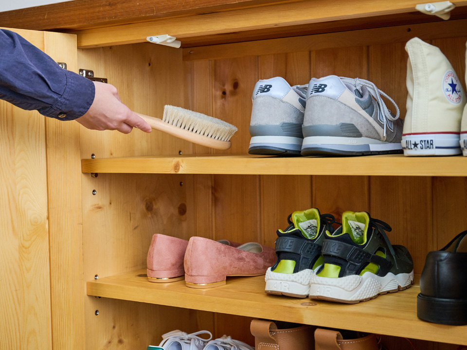靴についたホコリやチリなどを落とすためのブラシです。持ち手があるので靴を履いたまま使用でき、気付いた時にすぐにケアができます。家に帰ってきた時や久しぶりの靴を履く時、サッとブラシをかけて汚れを落とすことで靴のキレイを長く保つことができます。
