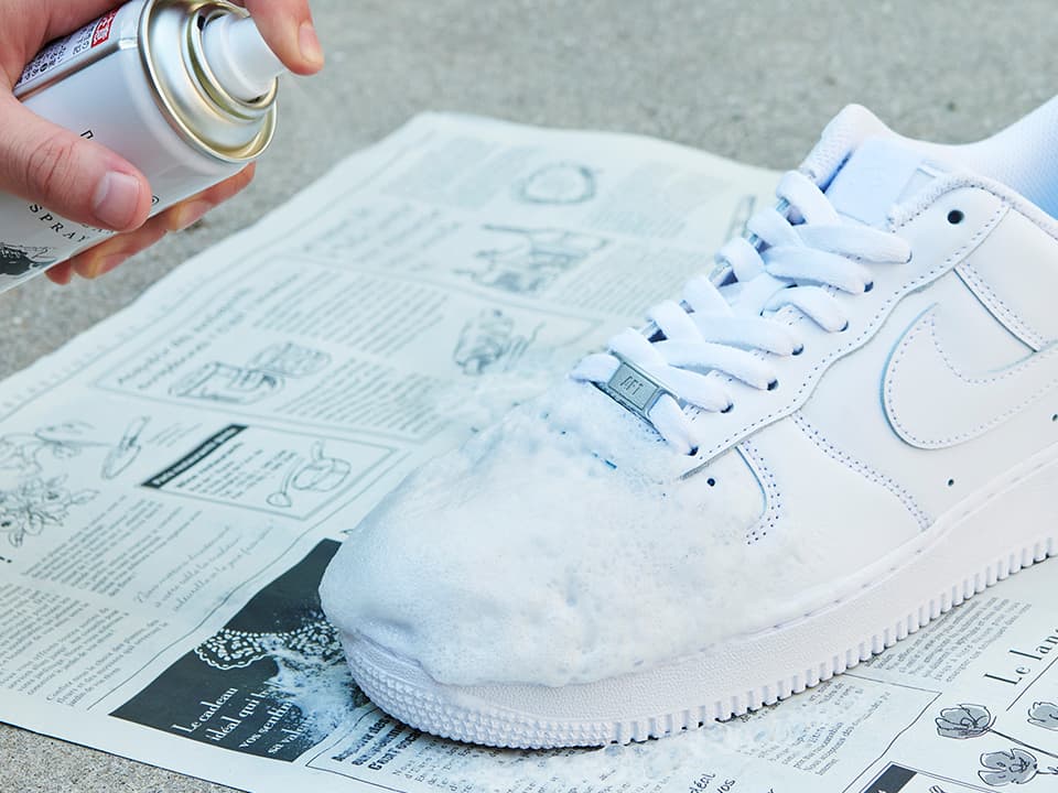 靴に直接スプレーせずに、乾いた布に2〜3秒スプレーしなじませた後、汚れをやさしく拭きとってください。