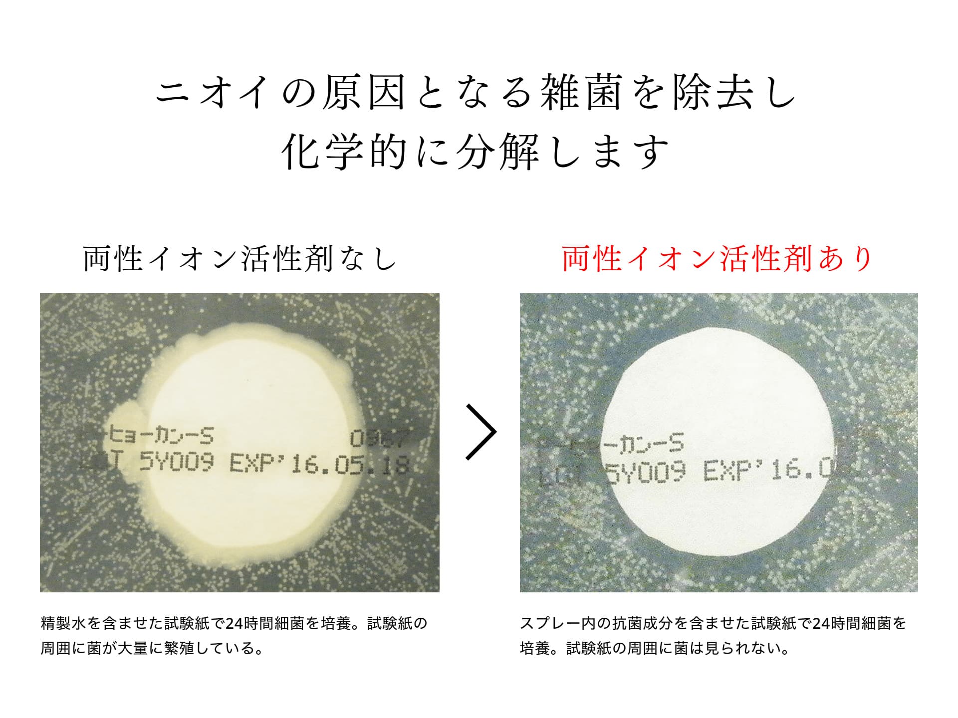 医療現場でも使用される両性イオン活性剤を配合。靴の中をしっかりと除菌することで、ニオイのもととなるバクテリアの発生を防ぎ、靴を快適な状態に保ちます。